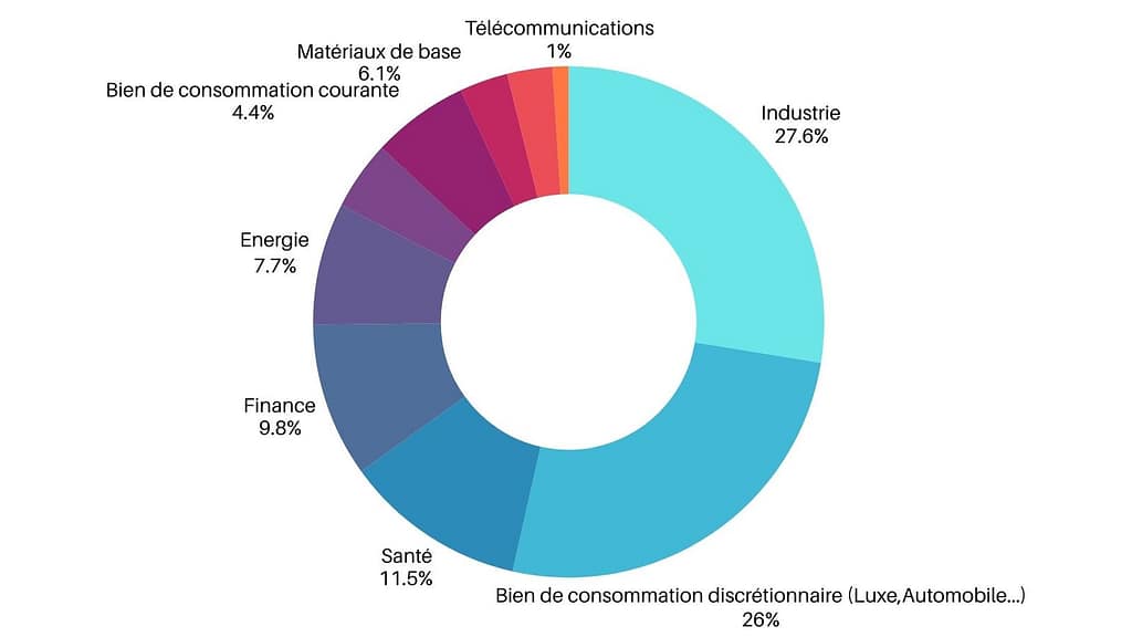 Bien que la limite de 15 % par entreprise limite la domination de LVMH, le CAC 40 reste concentré sur quelques secteurs. Le luxe (LVMH, Hermès, Kering hors indice mais autres), l’industrie et l’aéronautique représentent plus de la moitié de l’indice. L’énergie est réduite à un seul acteur, et la tech est quasi absente.